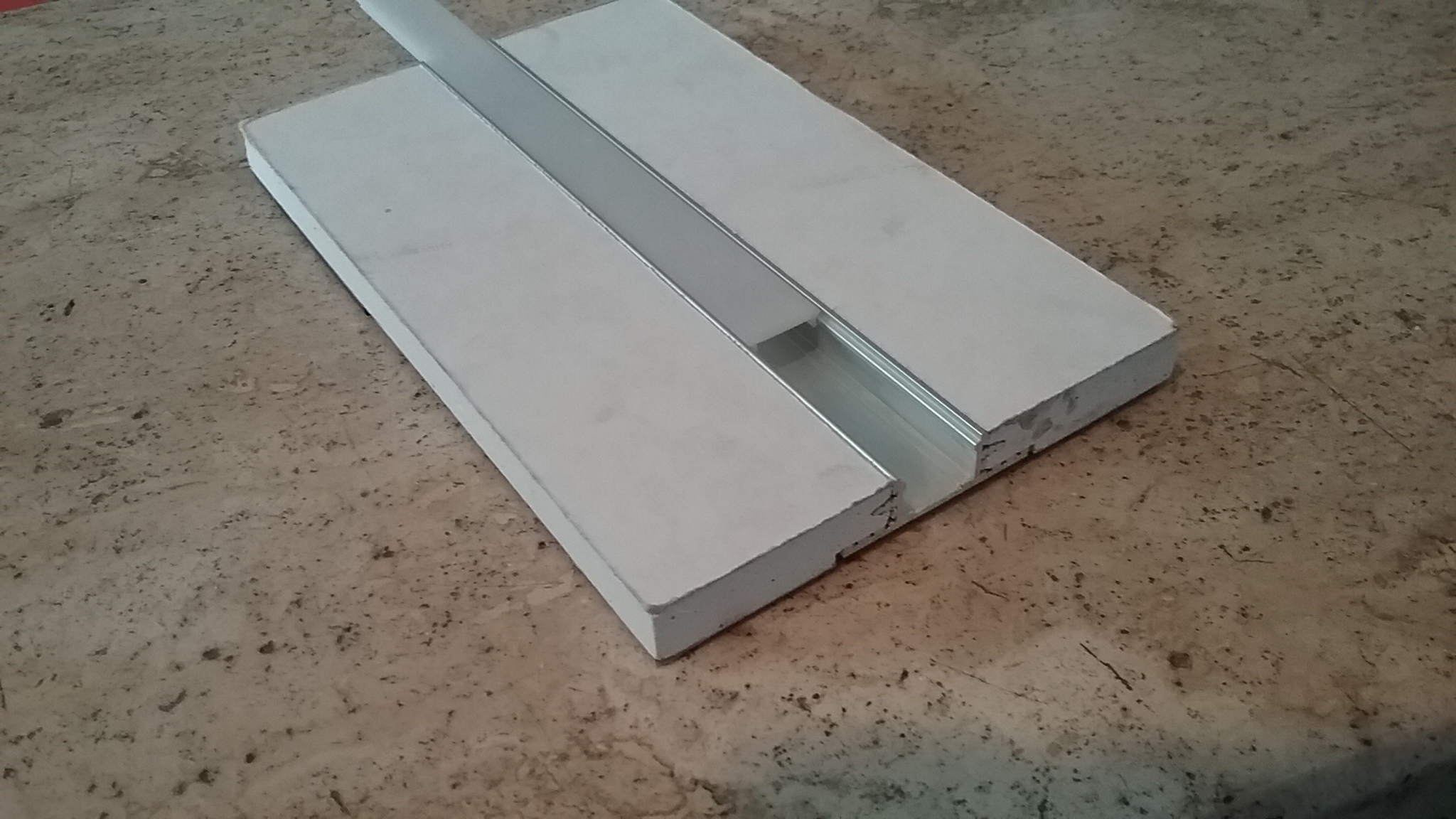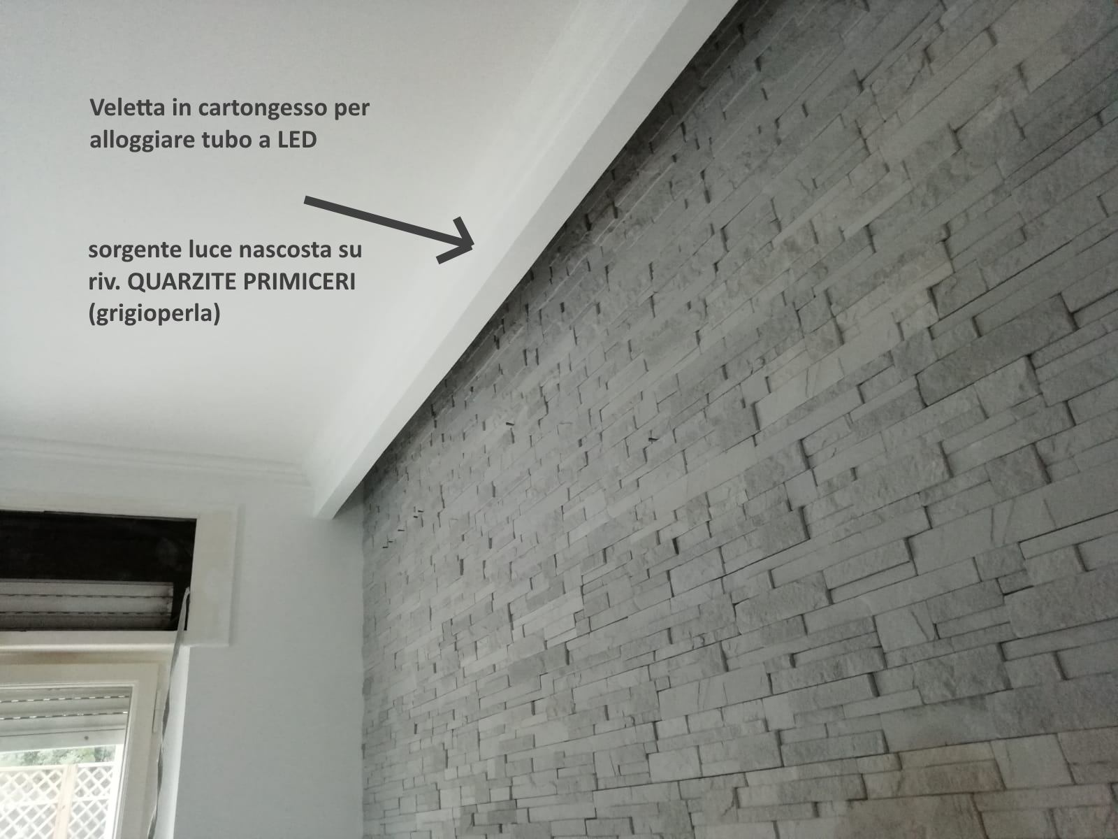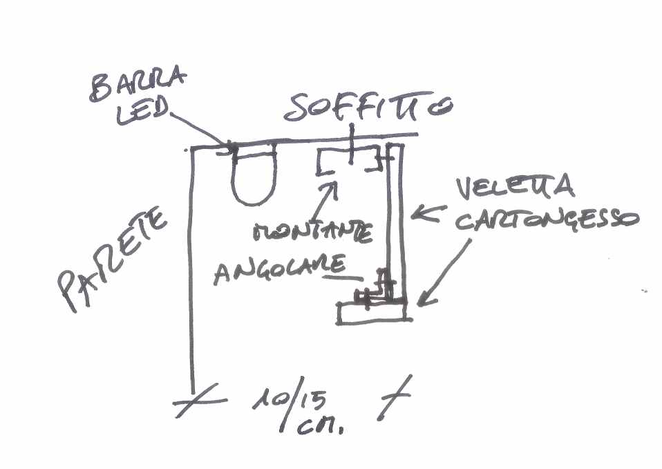 La veletta svolge la funzione di “cornice” al rivestimento (marcando il senso di arredo) sia di fornire la sede per alloggiare un tubo a LED che ha il compito di illuminare dall’alto il rivestimento. Più o meno cosi: