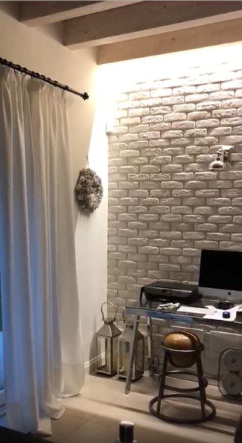 Osserva queste due foto accostate. Si tratta della stessa parete (in questo caso rivestita a mattoni). Guarda la differenza di luminosità fra quella dove a far luce c’è solo l’applique e l’altra con sorgente di luce indiretta (il tubo a LED è inserito nell’incavo fra l’ultima trave, che fa da veletta, e la parete rivestita).