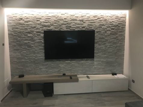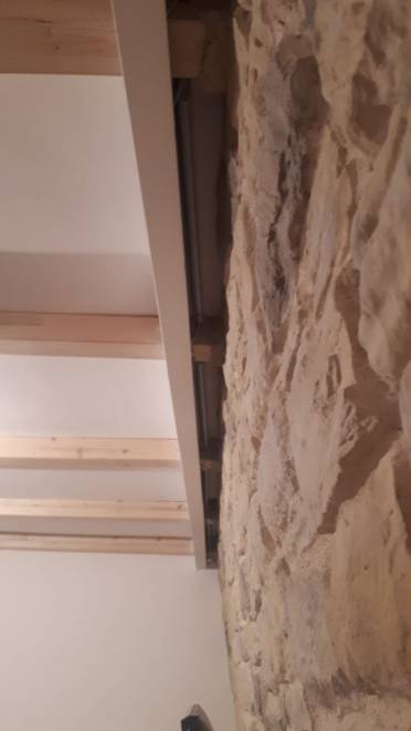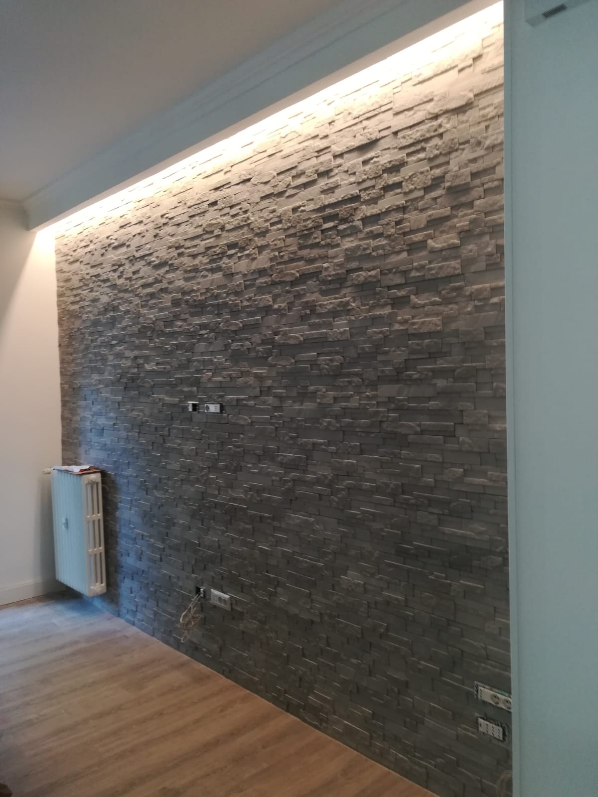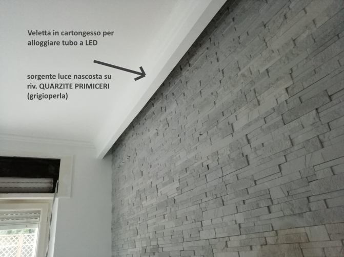 Immagina di dover mettere mano ad un ambiente che è già arredato. Si suppone che esista già un sistema di illuminazione. Per intendersi, se la parete da rivestire è in un soggiorno, è lecito aspettarsi che ci sia già una luce per la zona lettura, una per la televisione, un’altra (se c’è) per la zona pranzo che magari illumina il tavolo. Bene, in questo caso, volendo rivestire una parete la soluzione consigliata è quella, dove possibile, di creare una veletta (in cartongesso, in legno) distante 10-15 cm. dall’angolo superiore della parete rivestita dal soffitto (o contro-soffitto).