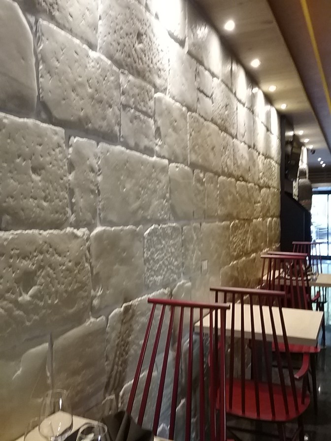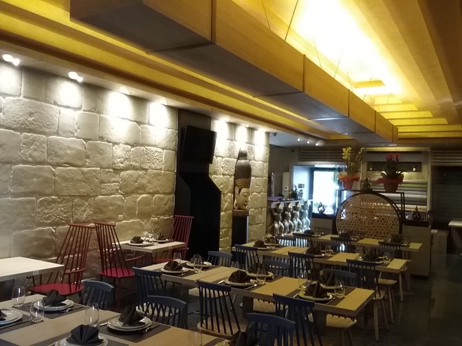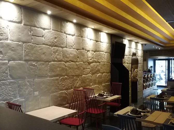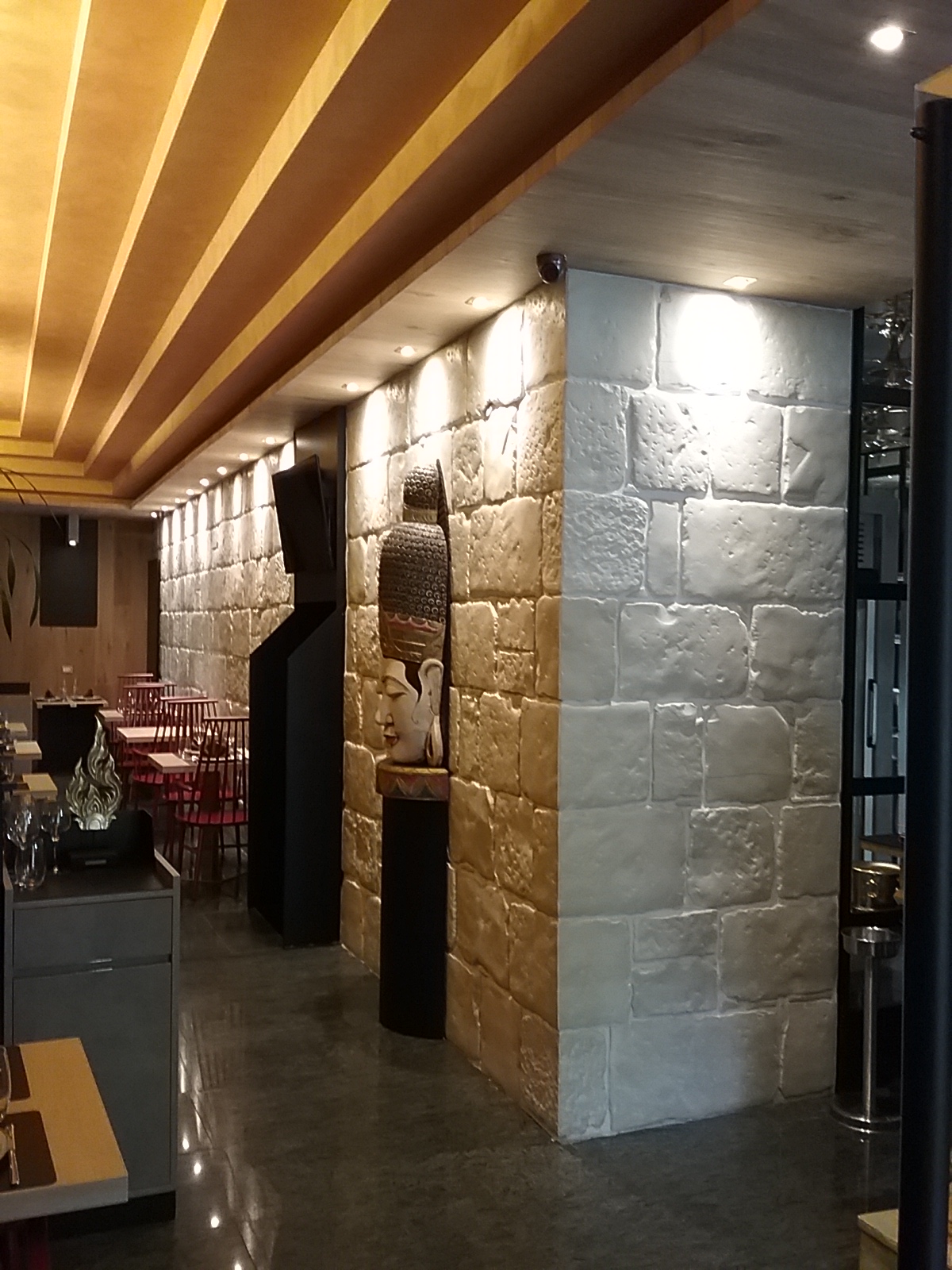 Dal punto di vista tecnico. Le piastre utilizzate sono le stesse che vengono impiegate di solito per la pavimentazione. Qui l’esigenza architettonica era quella di conferire al locale un qualcosa di esotico, con forti richiami al passato, quasi un tempio buddista, con le superfici del basolato a rafforzare questa sensazione. Completa la bellezza del locale un arredo curato in ogni dettaglio e un controsoffitto a dir poco strepitoso, che richiama i tetti delle pagode orientali.