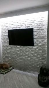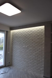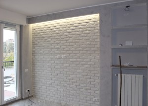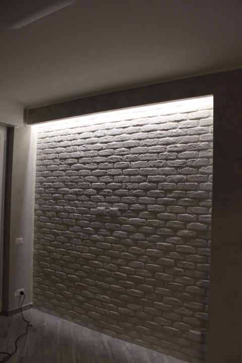 Parliamo dell’illuminazione. “Veramente avevamo pensato a dei faretti”. Gli chiediamo in quale ambiente di casa vogliono rivestire la parete. Nel soggiorno. Bene, avrete senz’altro già predisposto un sistema di illuminazione, per la zona lettura, per (se c’è) il tavolo “da pranzo”. Suggeriamo la soluzione che ultimamente abbiamo testato, quella a “sorgente di luce nascosta”.