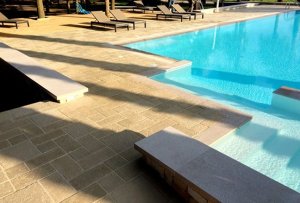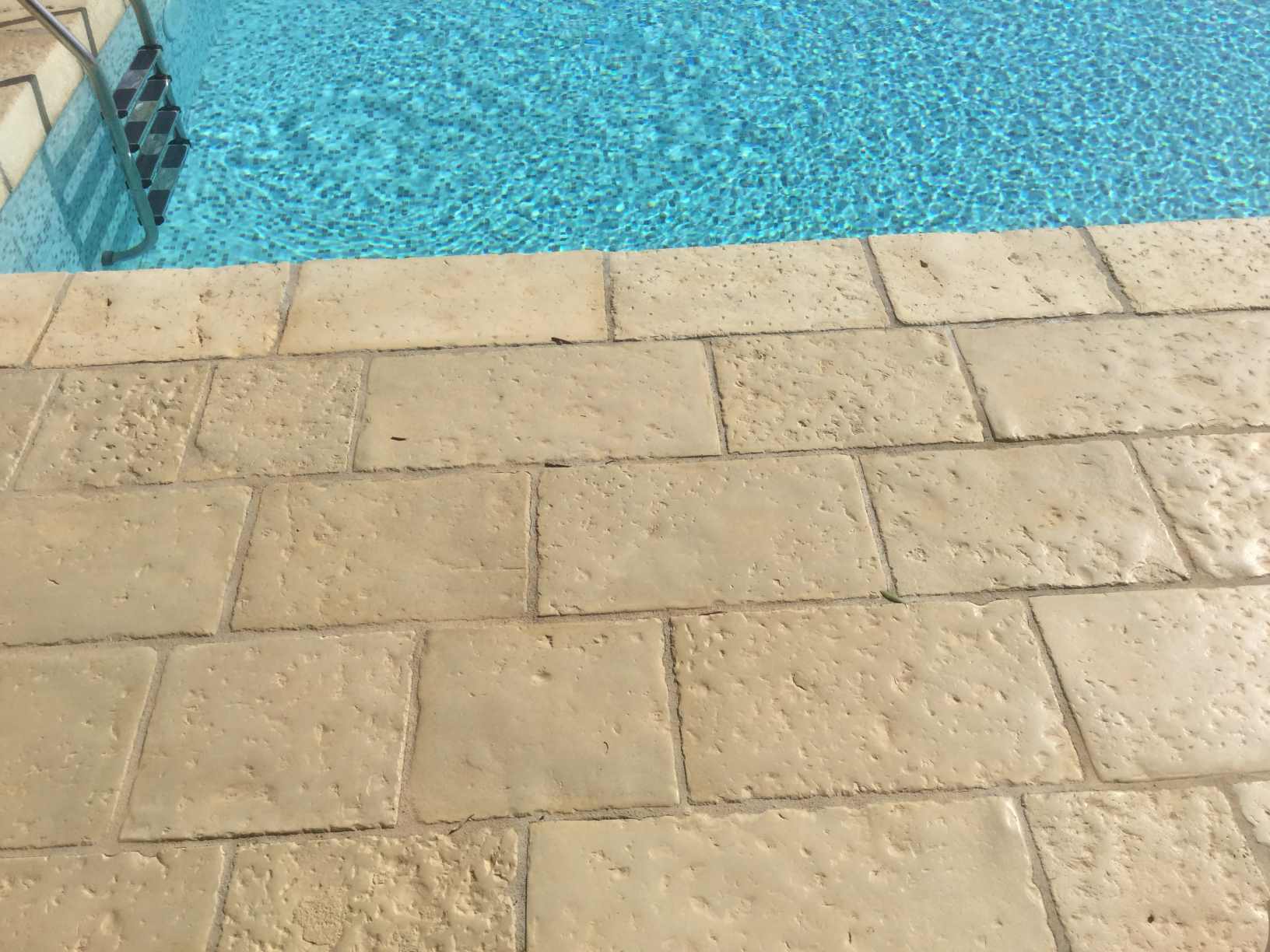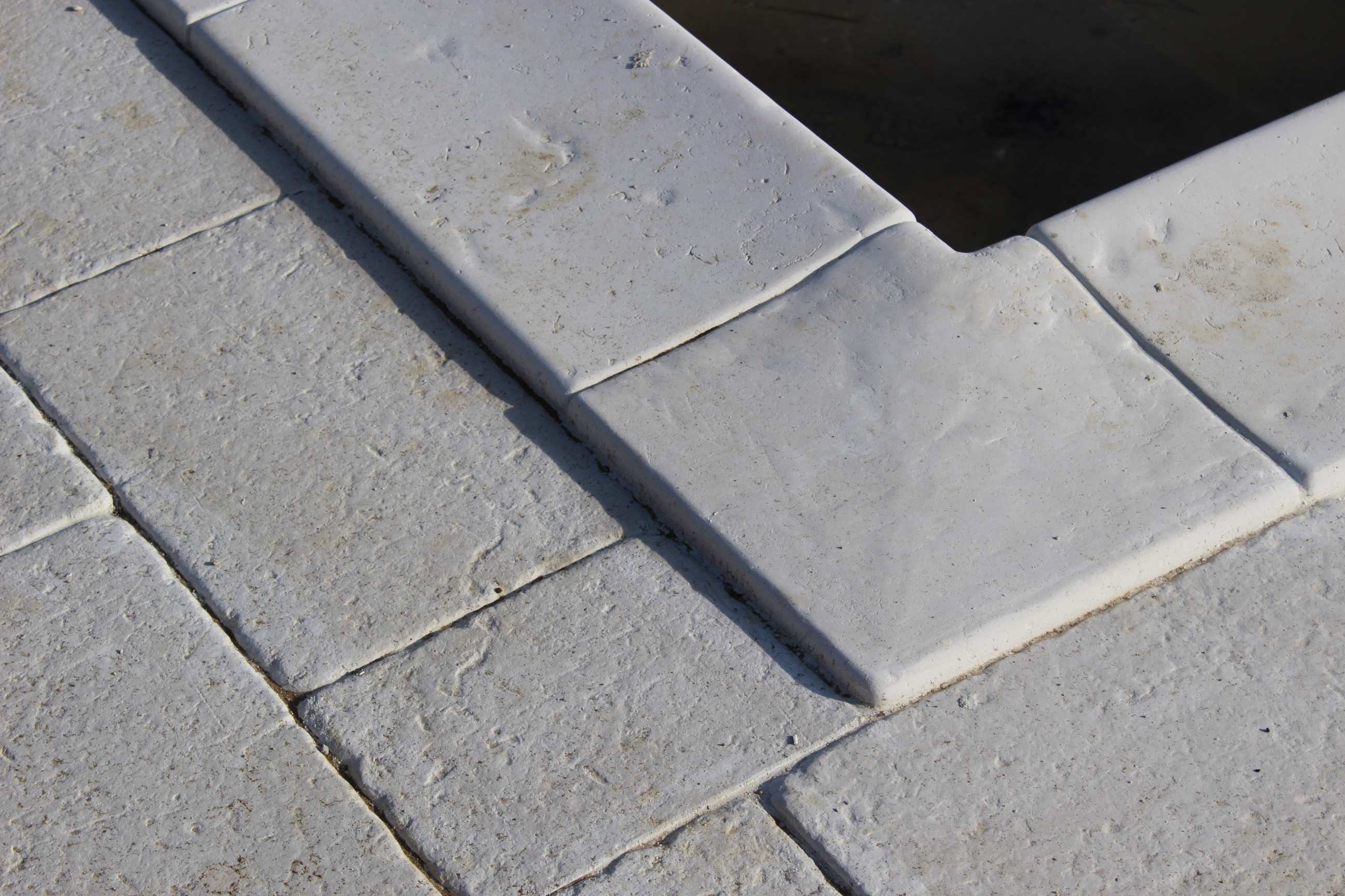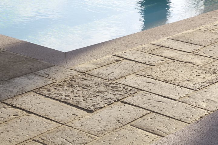 Ecco un’altro pavimento PRIMICERI che trova spesso impiego nei piani piscina. Ha i contorni regolari e presenta una superficie strutturata. L’effetto è quello della pietra rettificata, e viene spesso preferito quando ci sono problemi di quote del massetto da rispettare, essendo alto solo 1,8 cm.