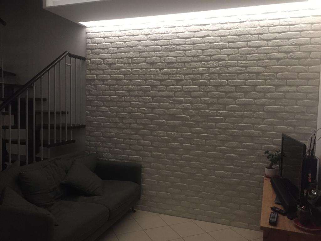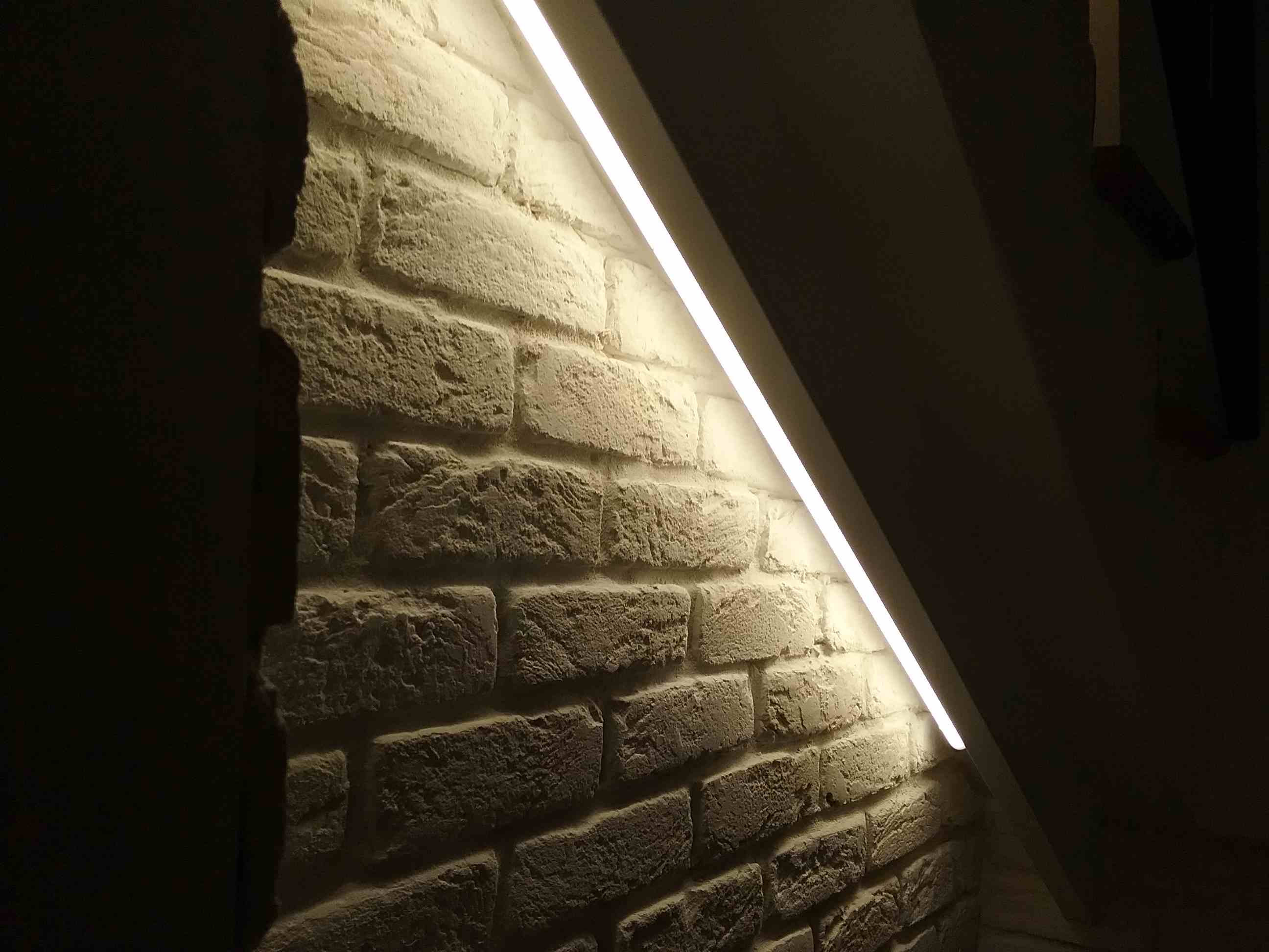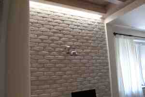 Già detto del “trucco” di tenere bassa la stuccatura (tassativamente a grana grossa per risultare esteticamente compatibile con l’aspetto antichizzato-grezzo dei mattoni, evitare gli stucchi a grana fina che risultano inappropriati per questo tipo di rivestimenti). Ottenuto il rilievo dei mattoni (che va detto sono tutti irregolari) un’illuminazione radente alla superficie avrà il compito di enfatizzare la parete, dargli il risalto necessario affinché brilli nell’ambiente nel quale è stata montata.