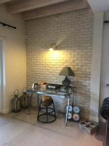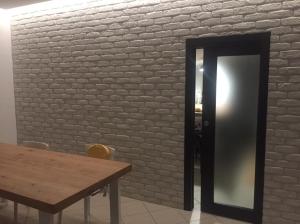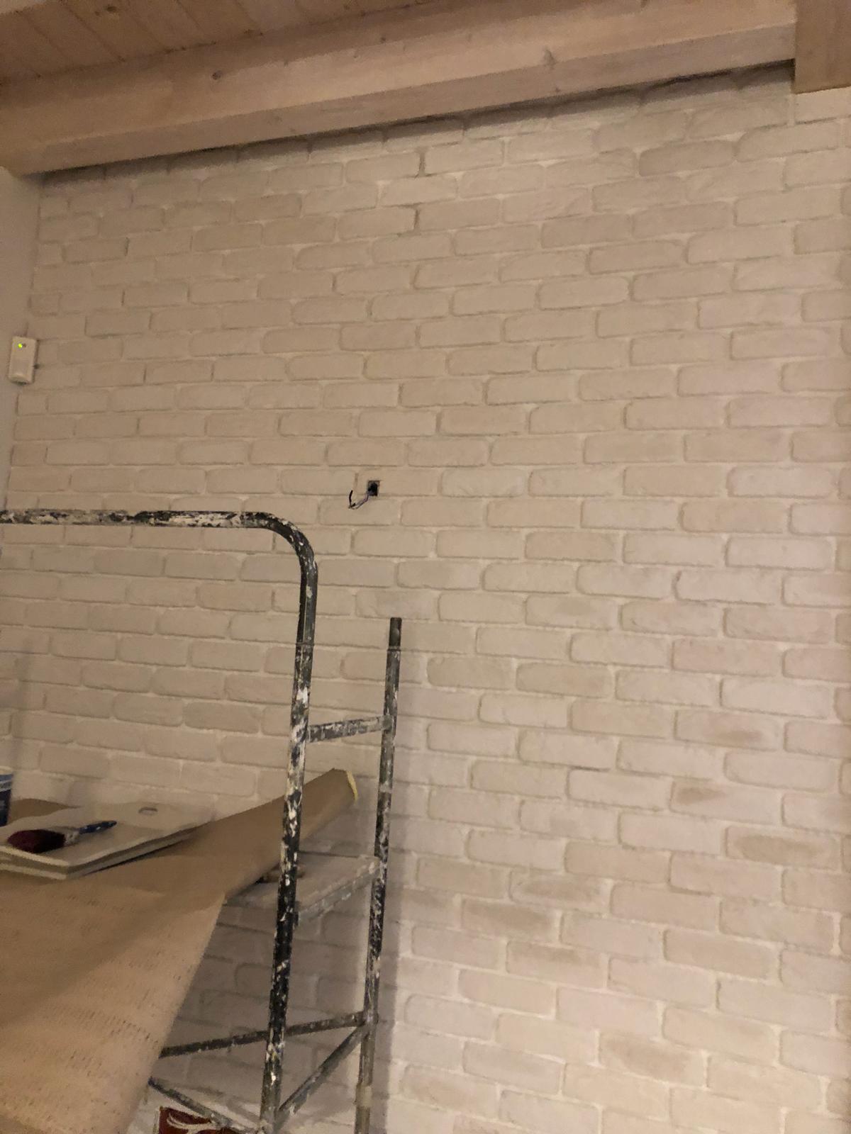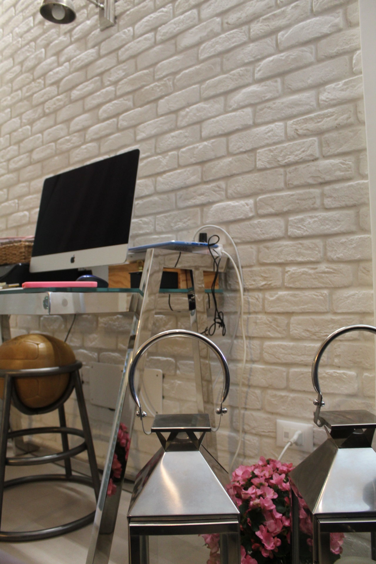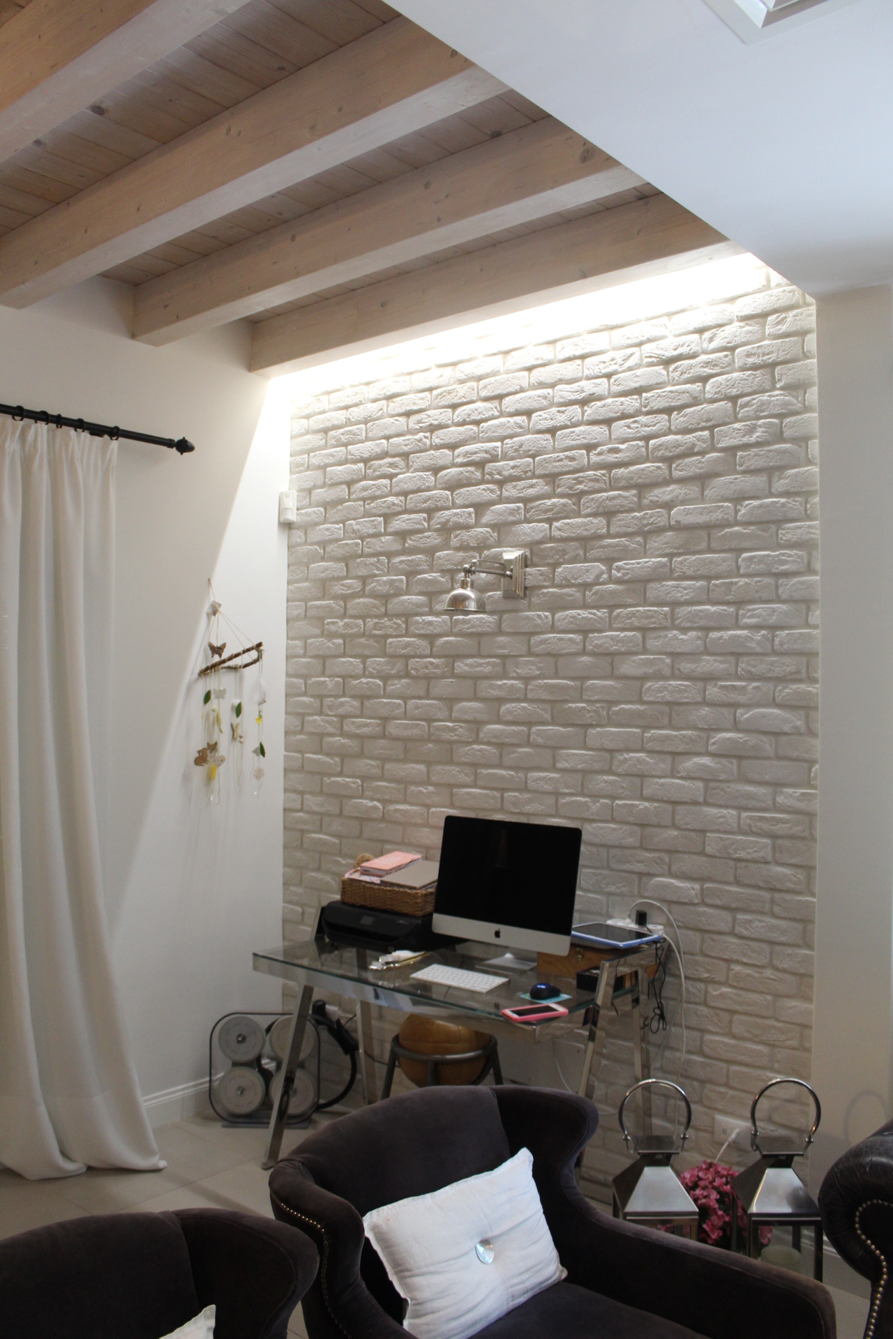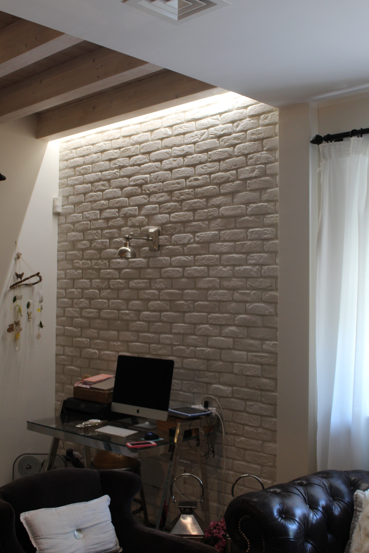 Una parete di appena 7 mq. per “nobilitare” un angolo di casa. La proprietaria ci ha anche inviato un video durante la fase di stuccatura (sapientemente eseguita tenendo basso lo stucco e lasciando in tal modo a rilievo il gioco dei mattoni) e le foto a lavoro finito (manca l’illuminazione soprastante “a sorgente di luce nascosta” per la quale ha lasciato comunque la predisposizione come si intravede dai cavi parzialmente nascosti dalla trave.