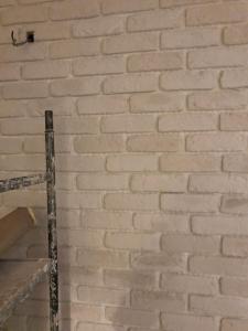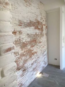 In genere è la traccia dell’intonaco (in passato si utilizzava il grassello di calce per la rifinitura di queste superfici). Ecco che quindi se vogliamo ricreare questo effetto abbiamo a disposizione dei prodotti, facilmente reperibili in commercio, che si chiamano appunto “Velature”. Sono delle miscele di resine e calce spesso già pronte (disciolte in acqua e vendute in barattoli). Con l’aiuto di una spugna si passano sulla superficie di mattoni in modo leggero, quel tanto che basta a “sporcarlo” lasciando appena un velo di bianco dal quale intravedere ancora i mattoni sottostanti. E’ un effetto molto particolare che va saputo dosare con cura. Non presenta grossi handicap salvo forse un leggero rischio di spolverio una volta che la velatura è asciugata. Ma il risultato è davvero sorprendente quanto a somiglianza con una vera parete in mattoni. Entrando a casa, ci si potrà prendere gioco amabilmente degli amici lasciandogli credere che si tratti davvero di una parete che è stata recuperata da sotto l’intonaco…sarà difficile accorgersi del “trucco”.