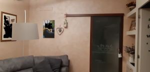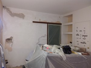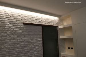 Se ci segui da un po’ avrai capito che siamo innamorati delle pareti rivestite illuminate da “sorgenti di luce nascosta” (qui, se vuoi, capisci perché)…e studiando la situazione è stato facile intravederla già, dello stesso spessore dell’ultimo traverso dell’armadio che insiste sulla destra, per dare anche una “continuità” estetica (la veletta contenitiva dei tubi LED è stata infatti pitturata con lo stesso colore, per restare “fedeli al tema” di dimensioni e di cromie).