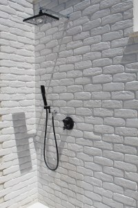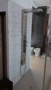 Il primo lavoro da fare, indipendentemente dal tipo di rivestimento che abbiamo scelto, è provvedere all’accurata impermeabilizzazione della muratura. Ricordiamoci che sarà sottoposta a continuo apporto d’acqua, proveniente dal doccione. Dobbiamo pertanto PRIMA di iniziare, trattare la parete con idonei materiali (su tutti, per praticità MAPELASTIC della Mapei o di azienda equivalente) che ci assicuri che l’eventuale passaggio d’acqua non possa andare a creare danni alla parete (sia che confini con casa nostra che, tanto di più, quella del vicino)… Una volta impermeabilizzate le pareti della cabina doccia, si può iniziare a montare il rivestimento. Per un aspetto pratico sono più indicati rivestimenti come PETRA o QUARZITE che non richiedono la stuccatura: si possono montare a toccare. Per farlo è bene andare su un collante C2TE (classificazione da esterno) o meglio ancora un collante codificato S1. Sono adesivi cementizi che, proprio perché pensati per lavorare all’esterno garantiscono un miglior comportamento in presenza di umidità (a prescindere dall’intensità di utilizzo una cabina doccia ha le pareti fortemente esposte a questa condizione di lavoro, un ambiente umido per definizione).