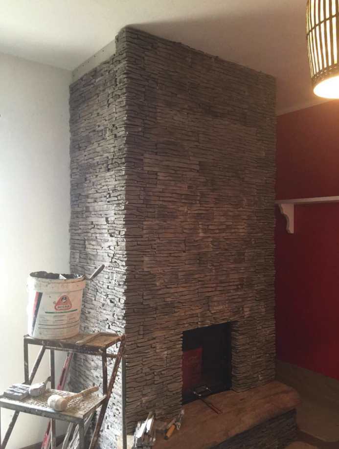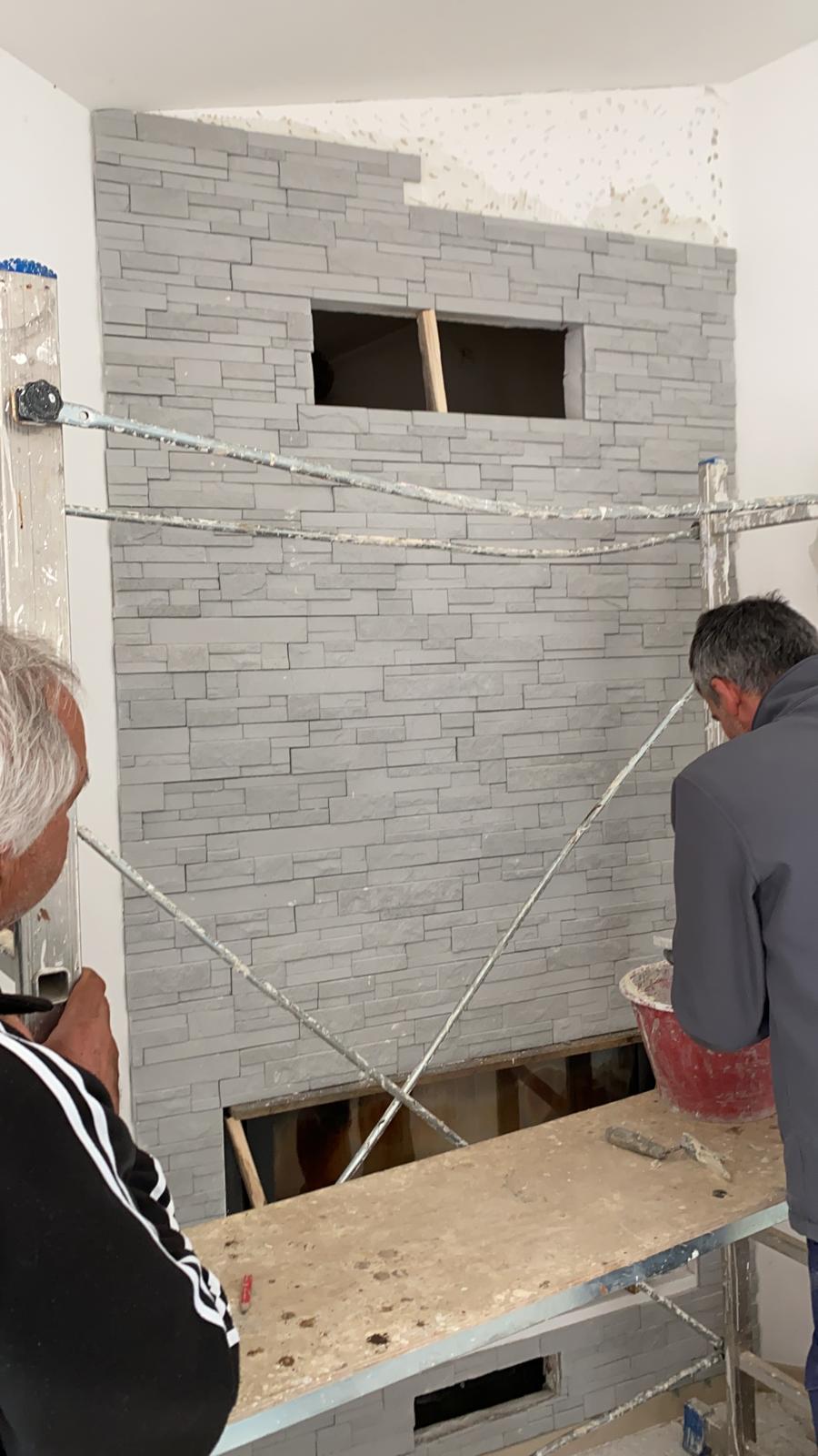 Un altro work in progress di una camino rivestito con QUARZITE (grigioperla):