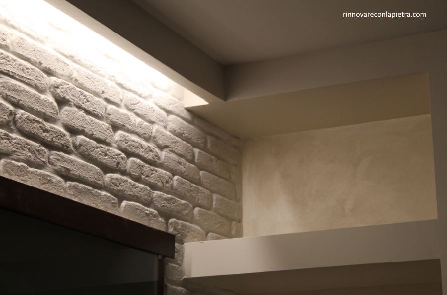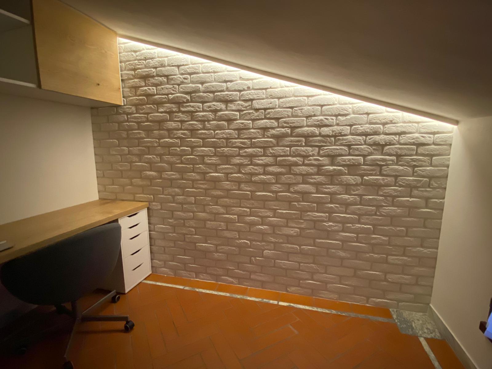 Ecco una mansarda arredata con una parete in mattone bianco e illuminata intelligentemente da una sorgente di luce nascosta (se vuoi sapere perché la luce è un elemento essenziale nella riuscita di un lavoro di rivestimento vai, se vuoi, all’articolo). Mattoni da rivestimento che arredano!