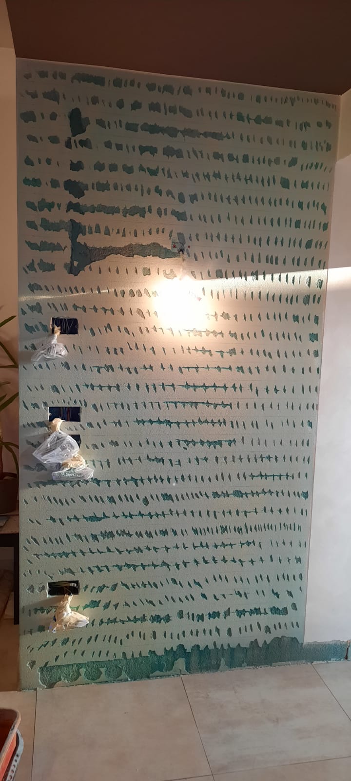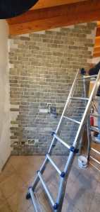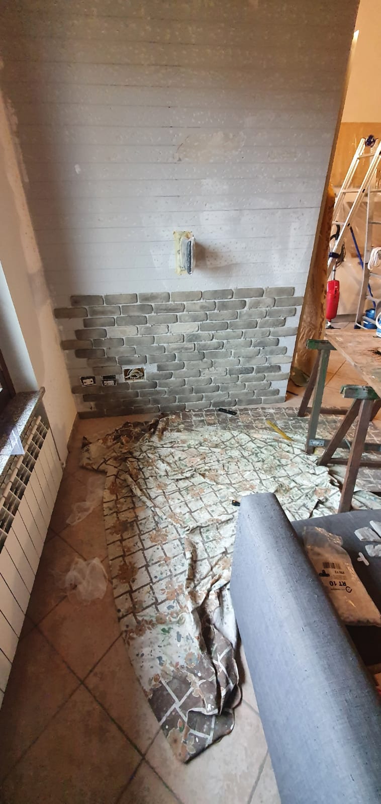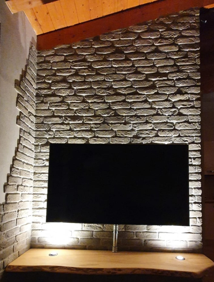 Questa preparazione va fatta prima di iniziare il montaggio vero e proprio. (sul perché è importante illuminare, qui se vuoi trovi info in più). Stessa cosa se prevedi, sulla parete rivestita, di inserire uno schermo tv, ti consigliamo di sparare la staffa porta schermo direttamente a parete e di girarci poi intorno con i mattoni di rivestimento e anche in questo caso avrai bisogno di una presa dietro lo schermo per il cavo antenna e quello di alimentazione della tv.