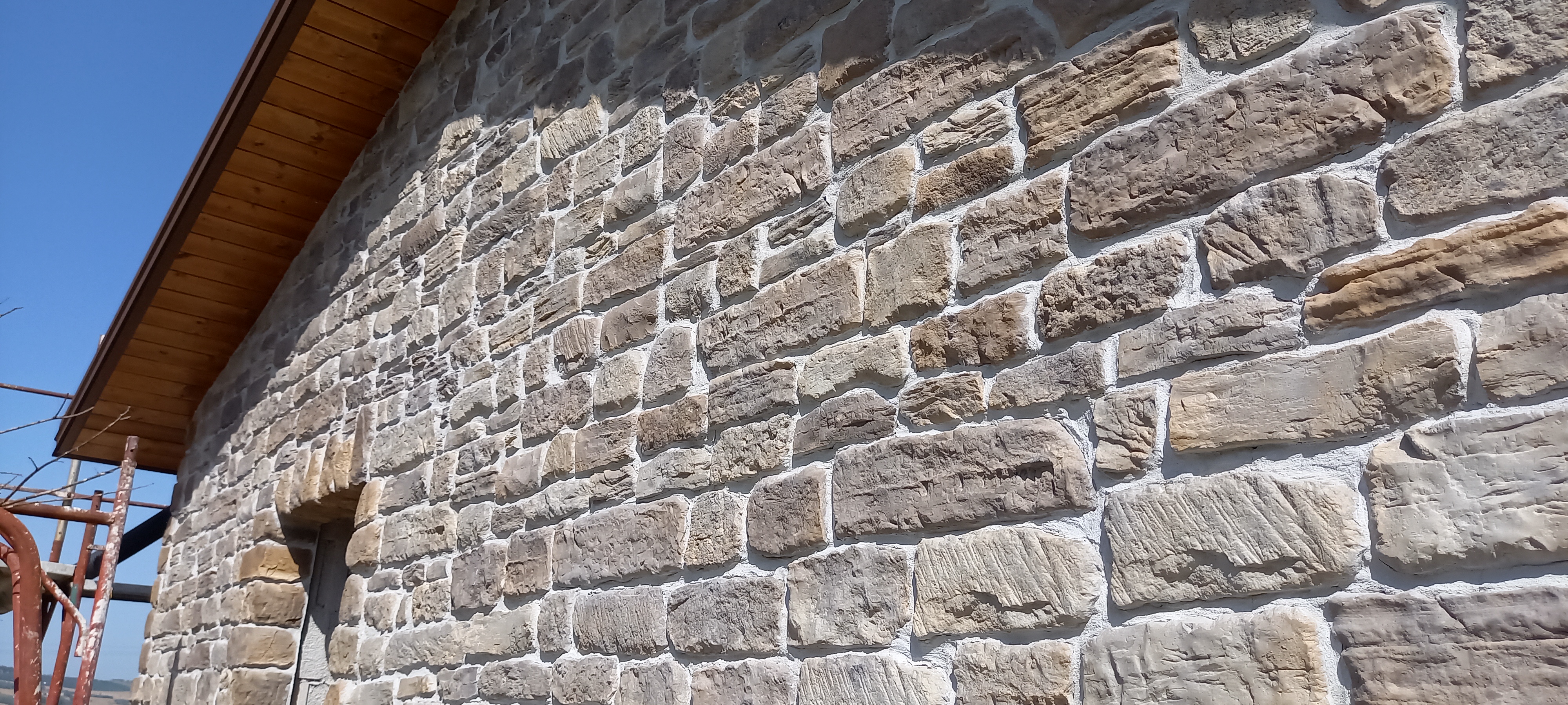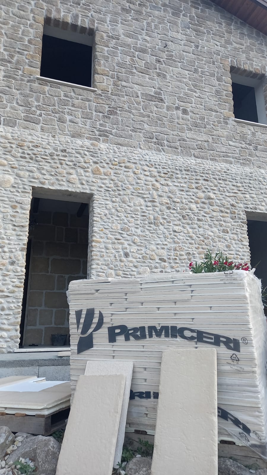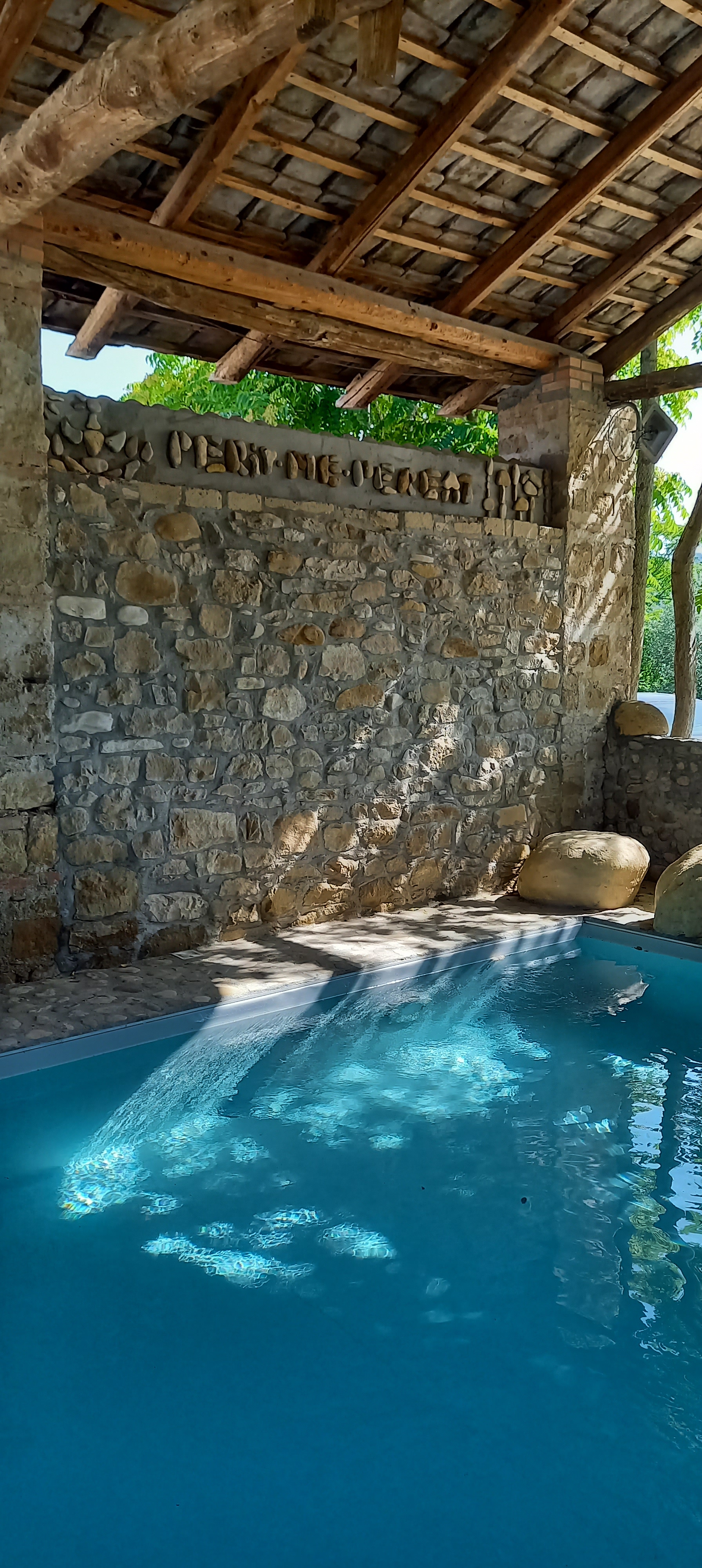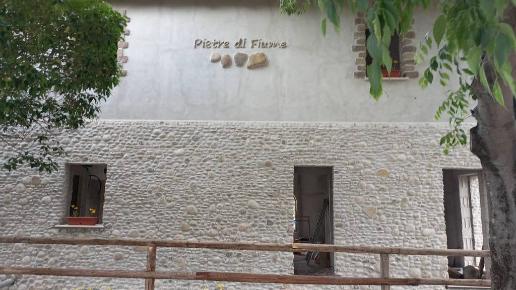 La parte superiore è stata rivestita con il rivestimento ROCCIA ANTICA. Sulla facciata opposta campeggia, realizzata con pietre di fiume, la scritta che da il nome alla struttura, su sfondo intonacato.