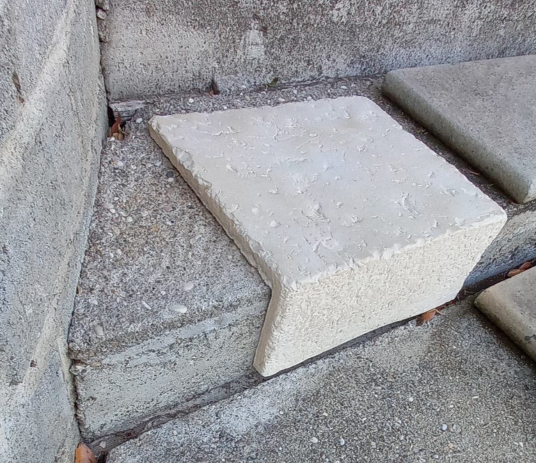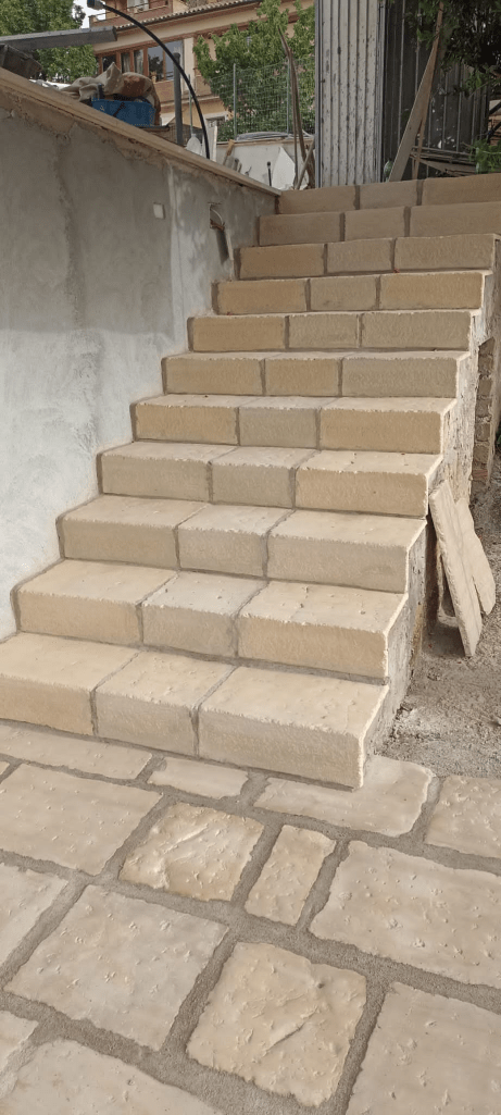 Il colore, dato “in pasta” (incorporato, non spruzzato) permette di ottenere nel tempo l’aspetto tipico della pietra vissuta, via via che viene transitato ed esposto agli agenti atmosferici, contribuendo se possibile a renderlo del tutto simile, come aspetto, a quello di antichi conci di pietra squadrata con i quali si realizzavano le scale prima dell’avvento del cemento armato.