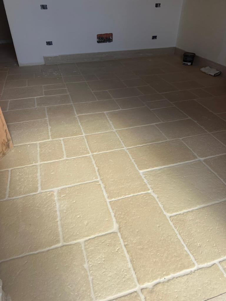 Quasi tutti i pavimenti in Pietra Primiceri hanno bordi arrotondati — Acaya fa eccezione — e questo cambia anche la resa visiva della fuga.