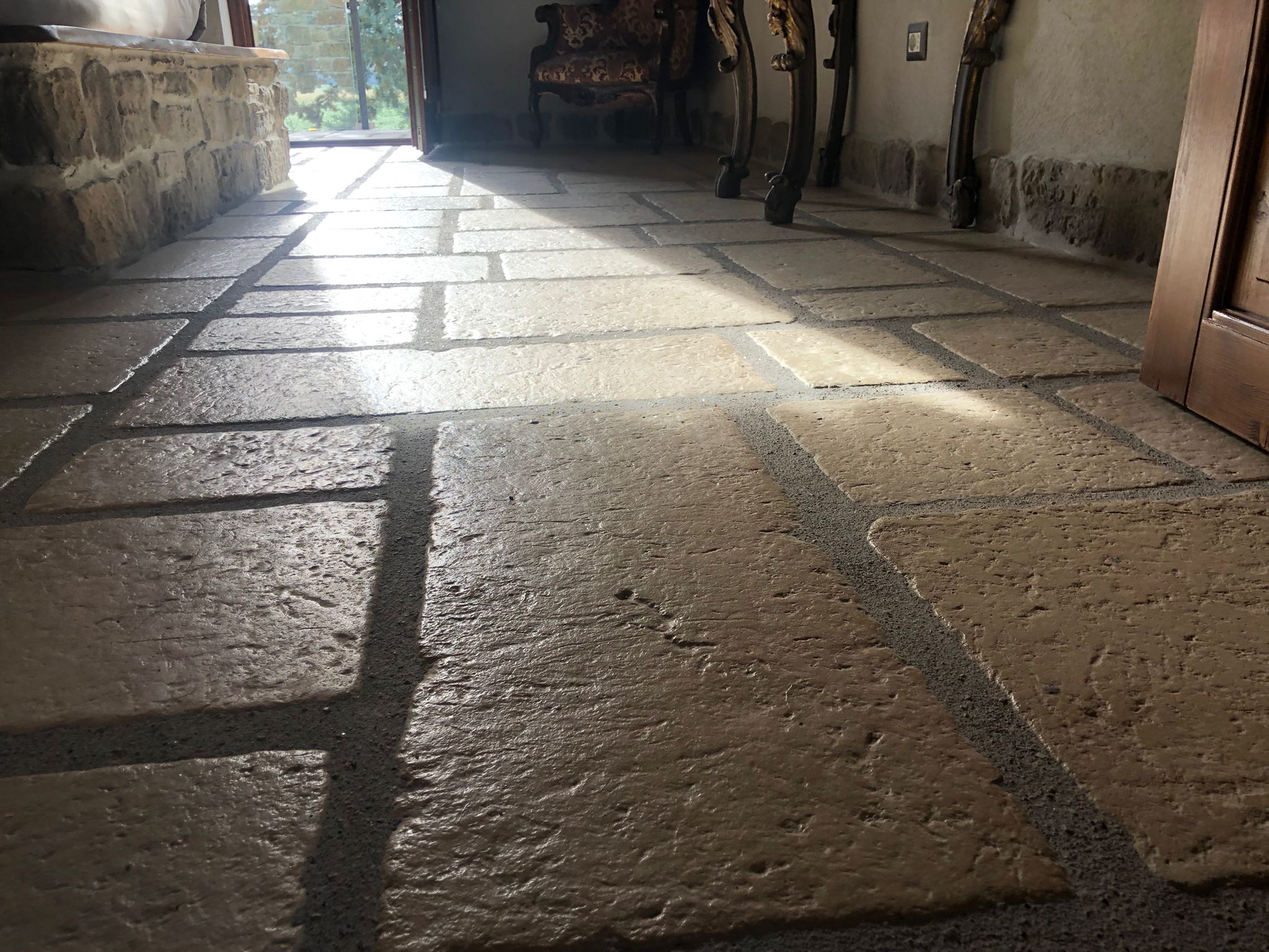Quasi tutti i pavimenti in Pietra Primiceri hanno bordi arrotondati — Acaya fa eccezione — e questo cambia anche la resa visiva della fuga.
