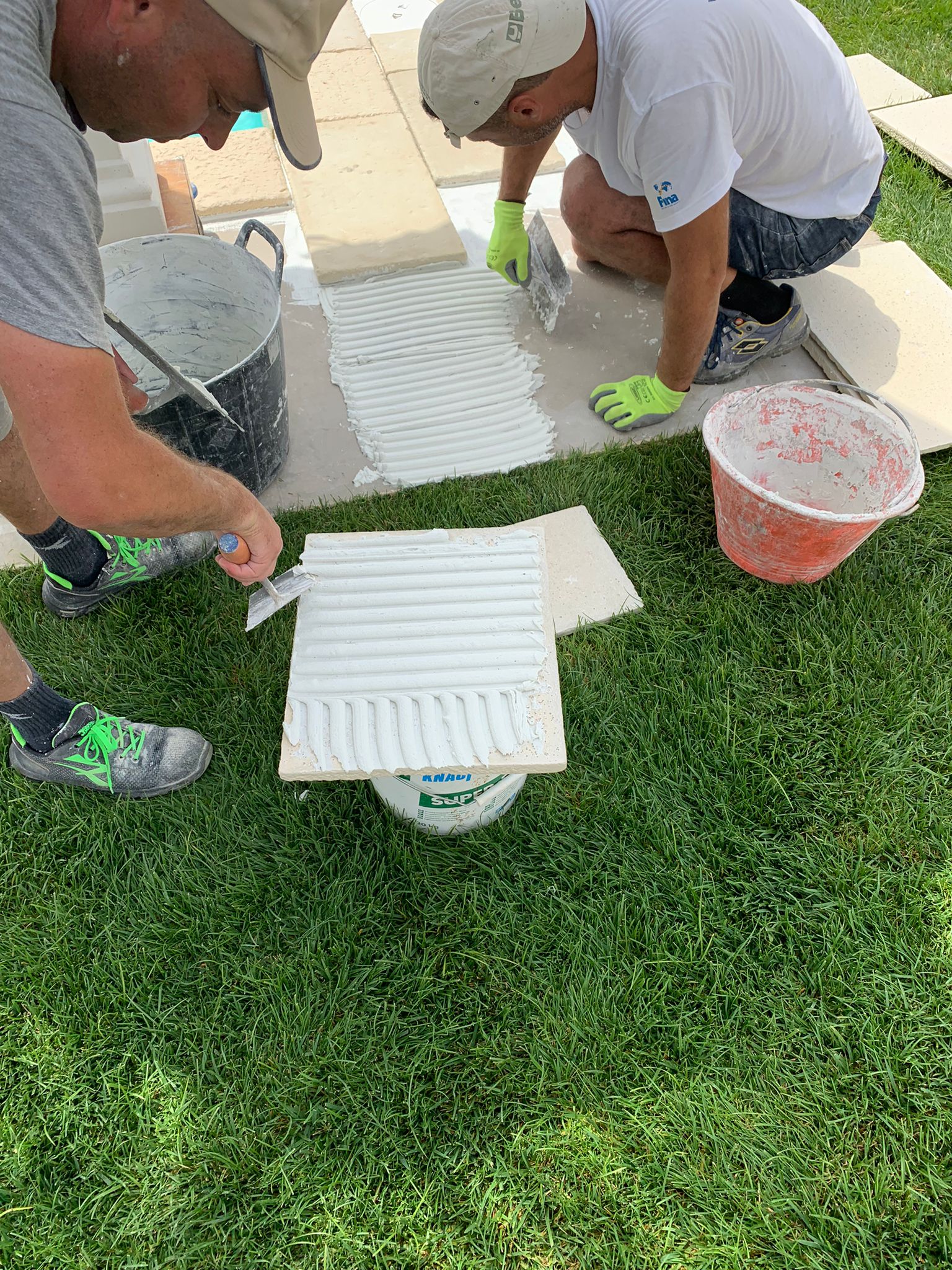La doppia spalmatura di colla (sia sul massetto che sul retro delle singole mattonelle) è ormai un must per ogni posatore che si rispetti. Perché assicura che in qualsiasi punto del pavimento questo non abbia “aria”, venendo in tal modo “vincolato” per bene al massetto sottostante. Cosa ancora più necessaria con un pavimento in pietra Primiceri che di suo può presentare delle irregolarità di complanarità sul lato sottostante.