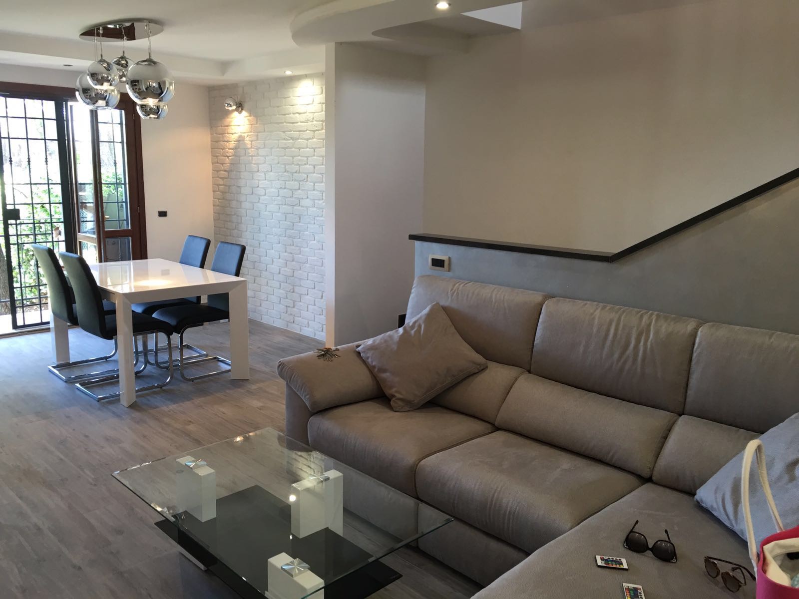 Altro soggiorno impreziosito da una parete in Mattone bianco: