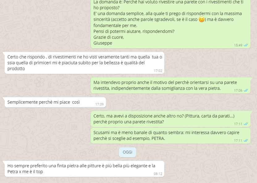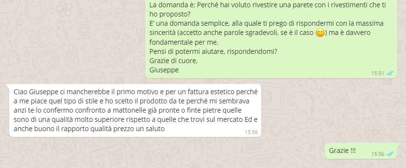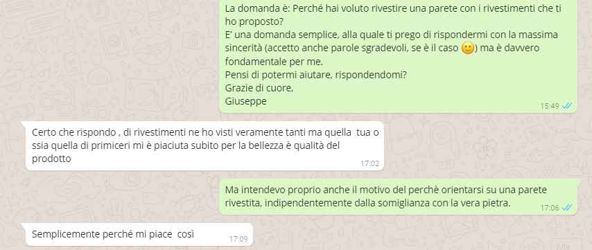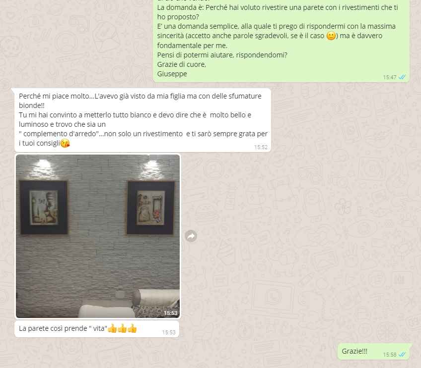“Chi si loda si imbroda”, recita un vecchio adagio. Ecco, non amiamo parlare bene di noi, lasciamo che siano i nostri clienti a farlo. Guarda questi brevi video, sono testimonianze, “feedback” ed interviste veloci a persone che hanno scelto i rivestimenti in pietra ricostruita per arredare le pareti di casa. La qualità di questi contributi, se da un lato può far storcere la bocca ai perfezionisti, dall’altro testimonia l’assoluta spontaneità delle referenze su rinnovareconlapietra.com, dove non c’e’ nulla di preparato, solo le riprese di un normalissimo cellulare e la soddisfazione dei nostri clienti.