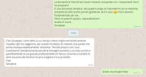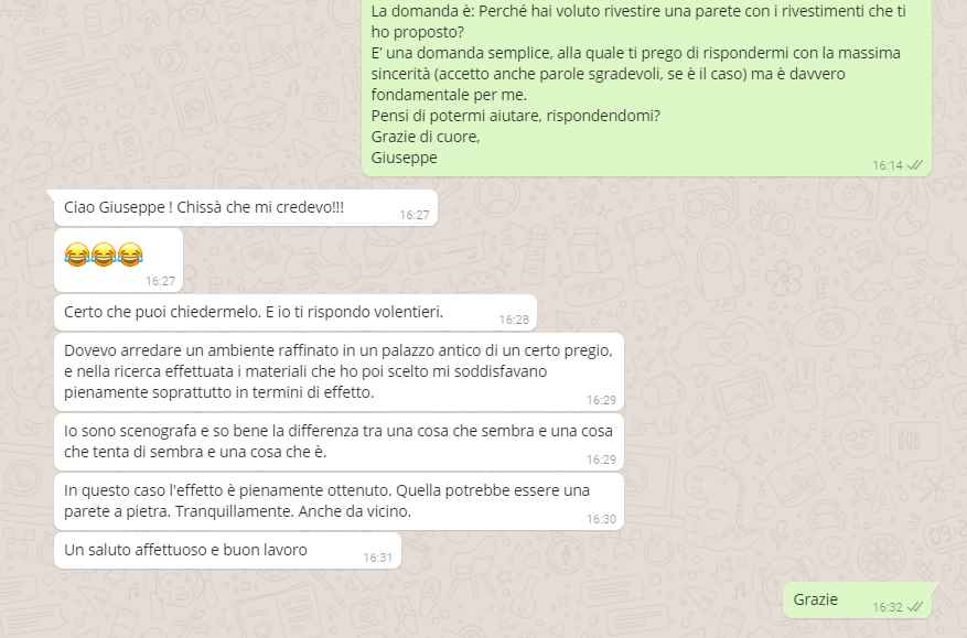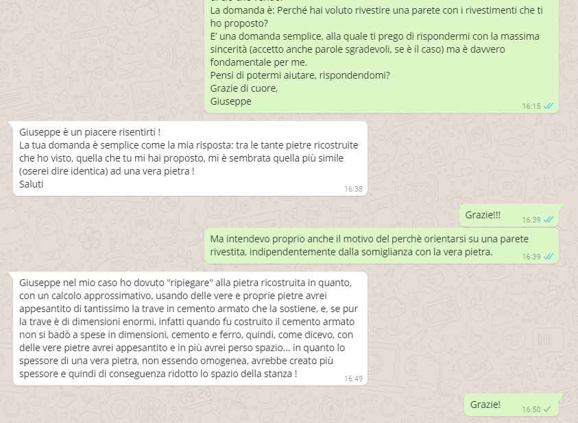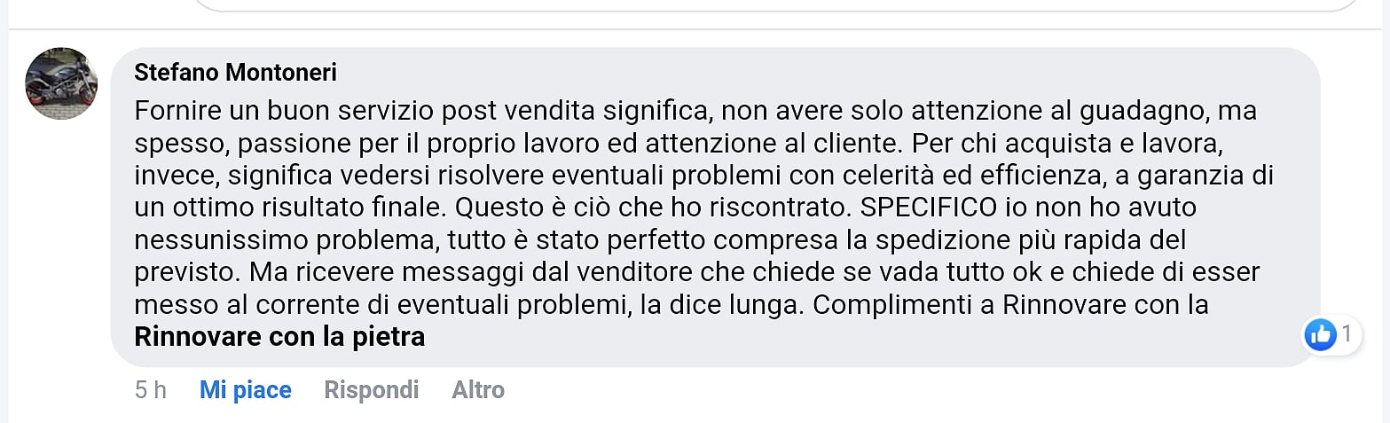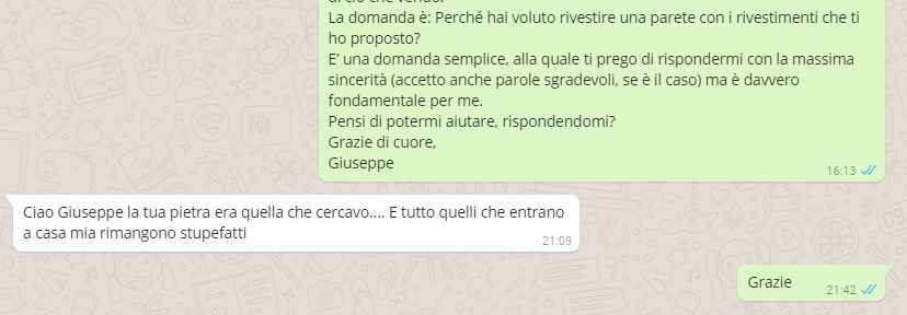 Sono due anni che seguivo questa pagina e non riuscivo a decidermi ,sono sincera ,avevo paura che da l’altra fosse un inganno ,invece proprio adesso ,due settimane fa ho deciso ,ho chiamato il sig,Giuseppe e in questo momento sto facendo i lavori ,non me l’aspettavo ,la mia casa a cambiato personalita ,bellissima ,era questo che cercavo e volevo ,seguendo i consigli di Giuseppe ,grazie di cuore ,affidabile ,onesto !auguro che la gente faccia la scelta giusta come me scegliendo rinnovare con la pietra !ai lavori finite vi faccio vedere il capolavoro che e venuto,!grazie ancora Ana